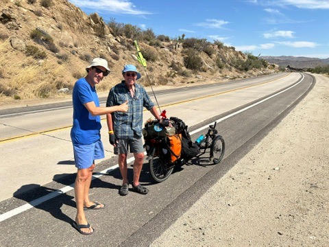 When I came closer to the Mexican border, I saw the US version of the Great Wall of China 😊, and stopped to take a few pictures. While I was trying to read the screen to take a PANO photo of the wall/fence, a car pulled up. Two Frenchmen, Frank and Philippe, came over, introduced themselves, and asked about the wall. I was not knowledgeable enough to answer all their questions and the conversation turned to the trike, my journey, and my destination. Fantastic folk! Not long after they drove off I noticed a text from them. They had sent the photos they had taken with me.